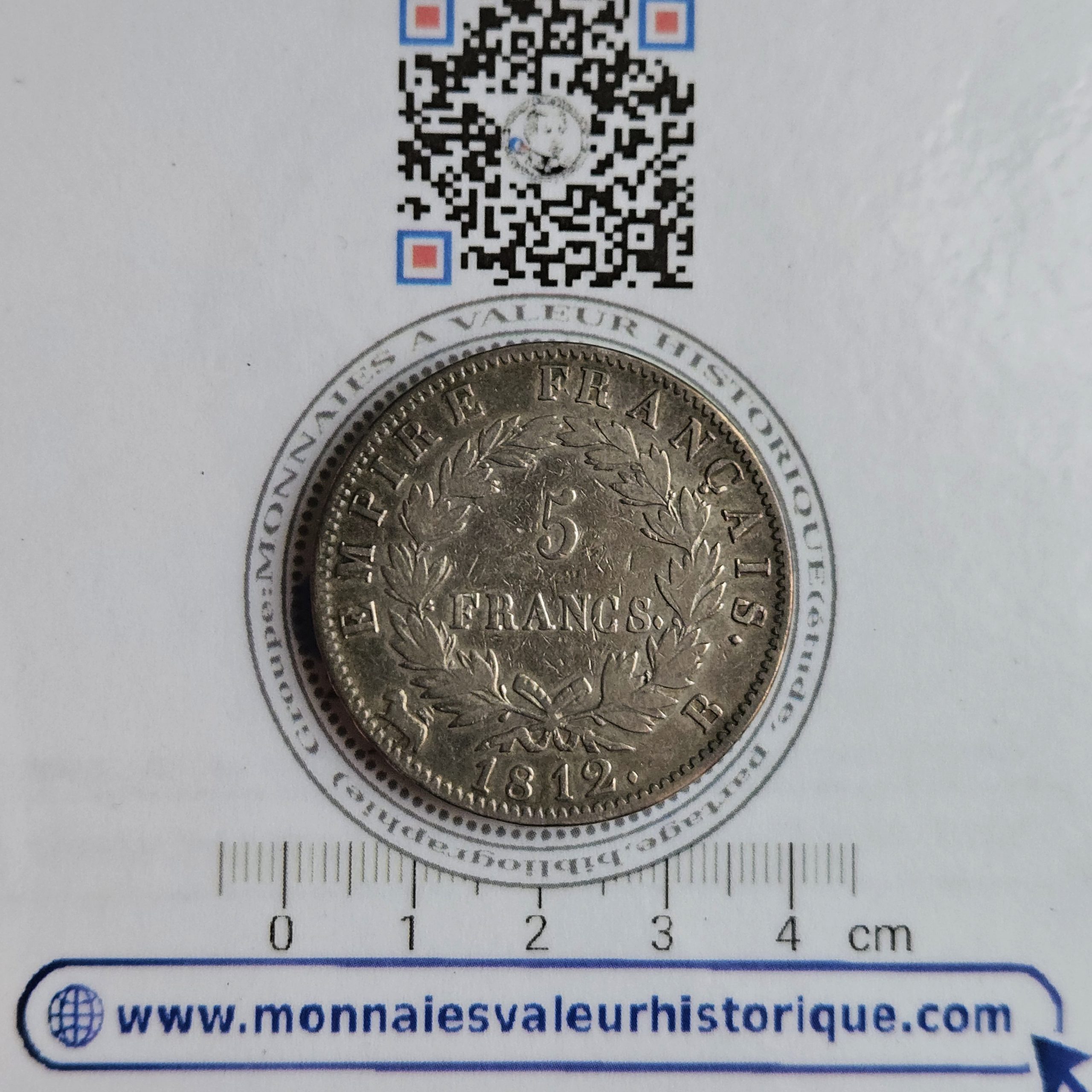 Le revers présente la valeur 5 FRANCS inscrite au centre d’une couronne de laurier, symbole de victoire et de souveraineté. La légende « EMPIRE FRANÇAIS », associée au millésime 1812 et à la lettre d’atelier B pour Rouen, inscrit clairement cette monnaie dans le contexte de l’apogée napoléonienne, à la veille de la campagne de Russie.