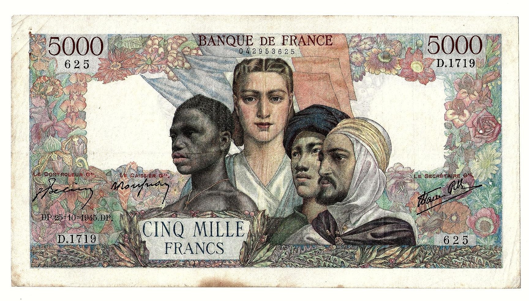 Billet 5000 francs français classique émis en 1945 sous le thème Empire Français, typique de la Banque de France entre 1942 et 1947 (référencé P #103 c dans les catalogues). Numista