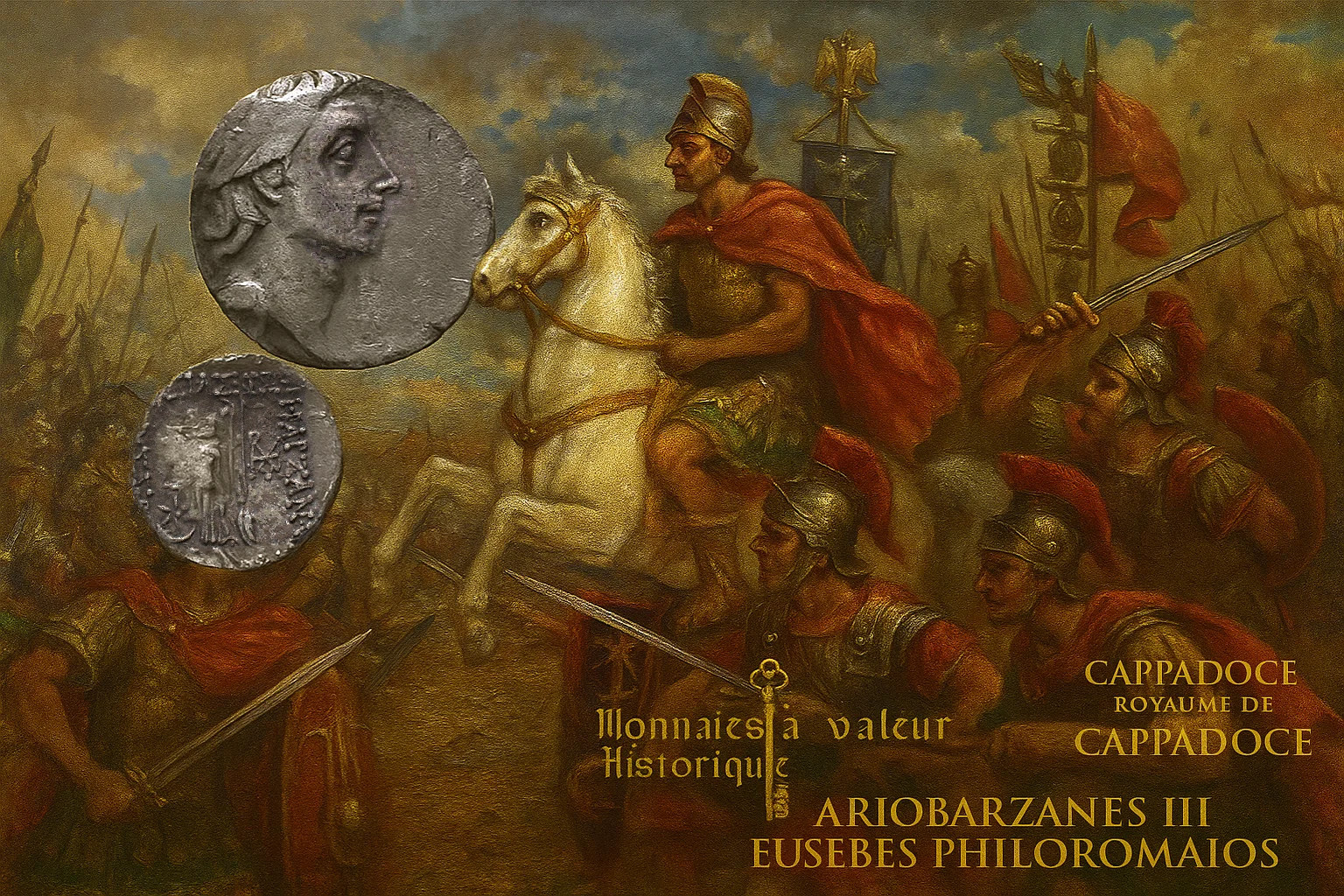 Roi de Cappadoce sous la République romaine, Ariobarzanes III Eusebès Philoromaios régna durant une période troublée marquée par les rivalités internes et l’influence croissante de Rome en Orient. Soutenu par les Romains, il porta fièrement le titre de « Philoromaios », « ami des Romains », qui symbolise la dépendance mais aussi l’importance stratégique de son royaume entre Orient et Occident.