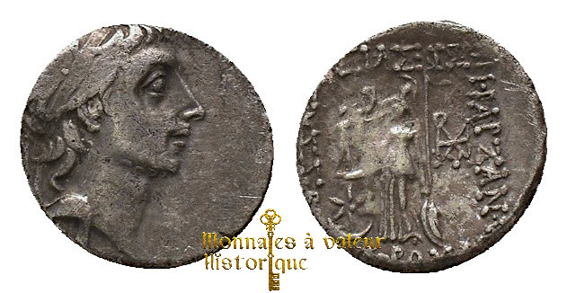 Revers : Athéna nicéphore debout à gauche, casquée et drapée, tenant une Niké de la main droite et une lance de la gauche, appuyée sur son bouclier. Symbole luni-solaire dans le champ gauche.