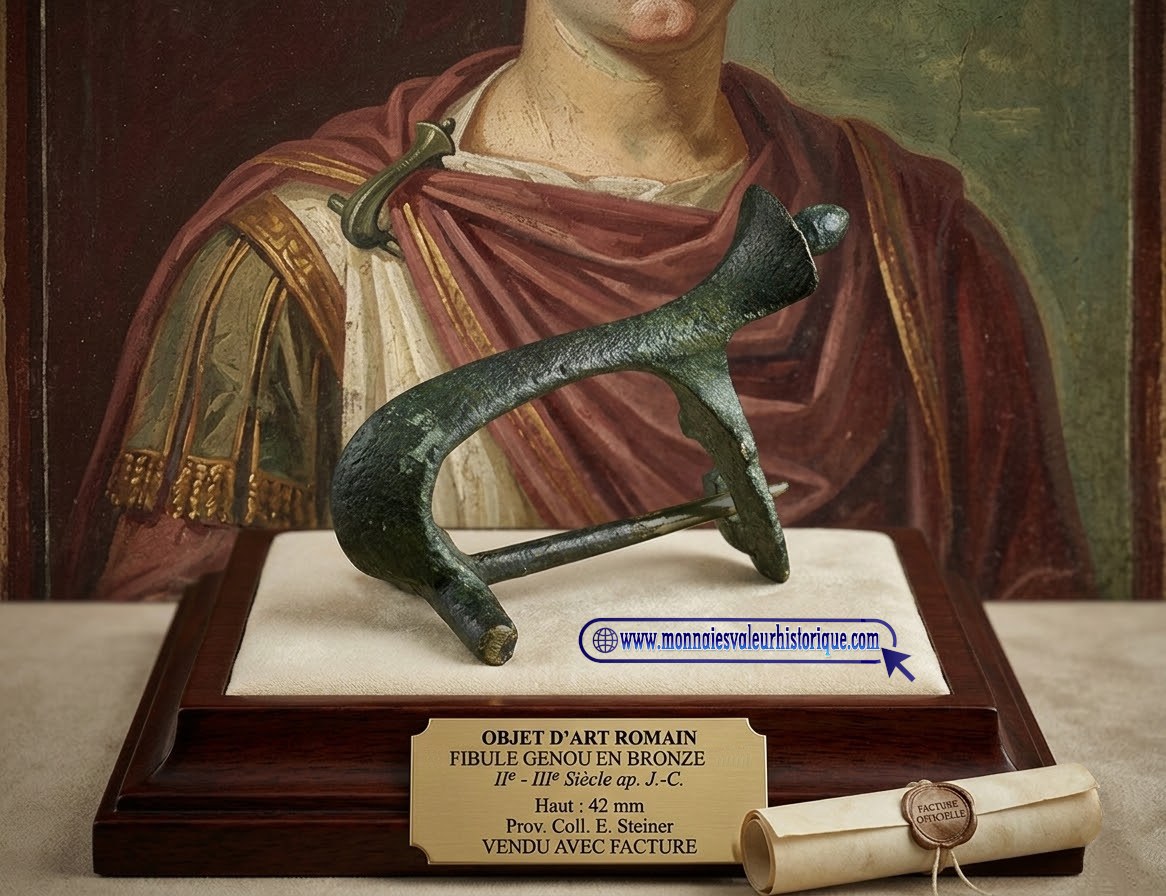 Ce superbe exemplaire de fibule à genou illustre le raffinement de l’accessoire vestimentaire masculin au cœur de l’Empire Romain. Cette forme de fibule, robuste et fonctionnelle, était particulièrement populaire au sein des légions romaines en tant que fixation pour le sagum (manteau militaire) ou la chlamys.