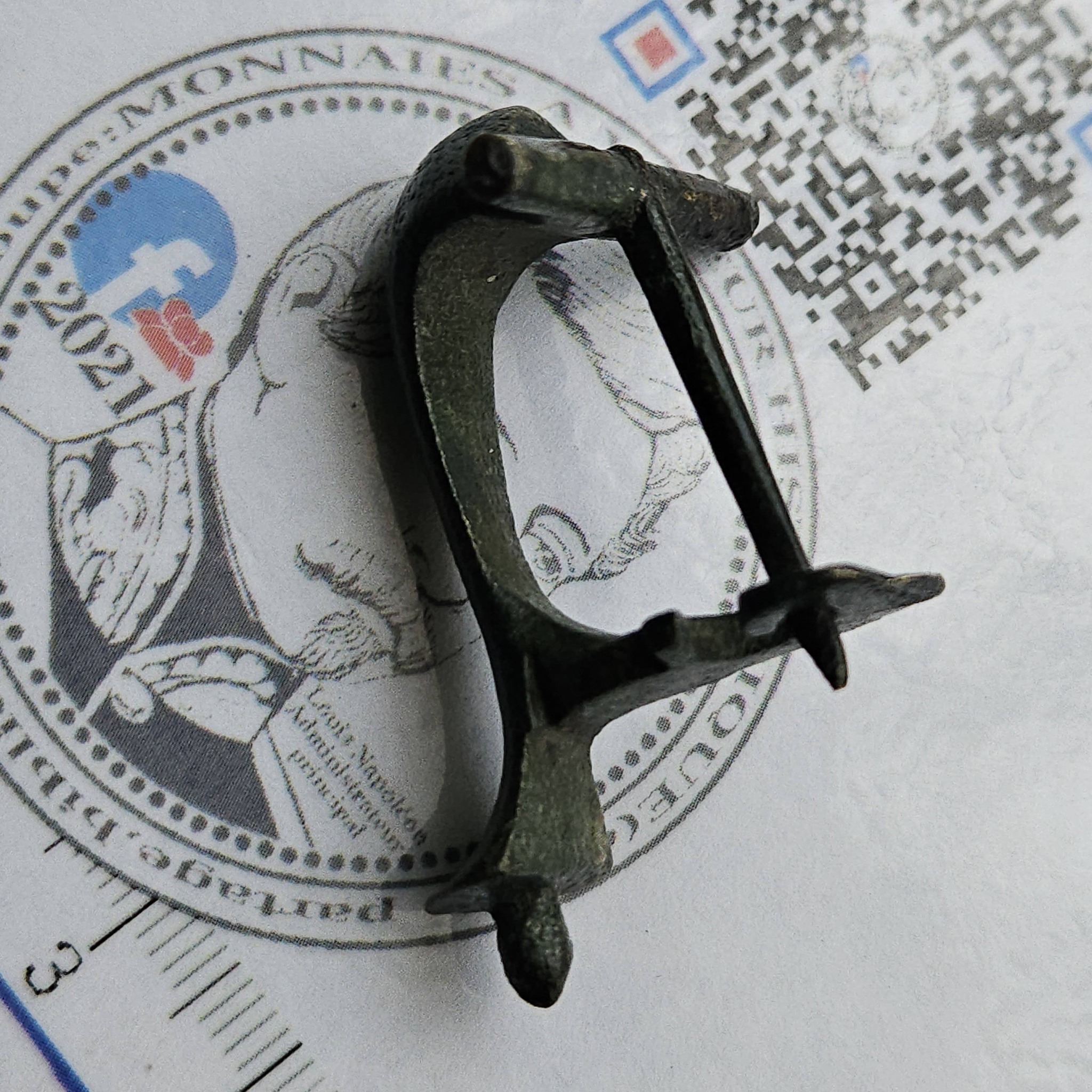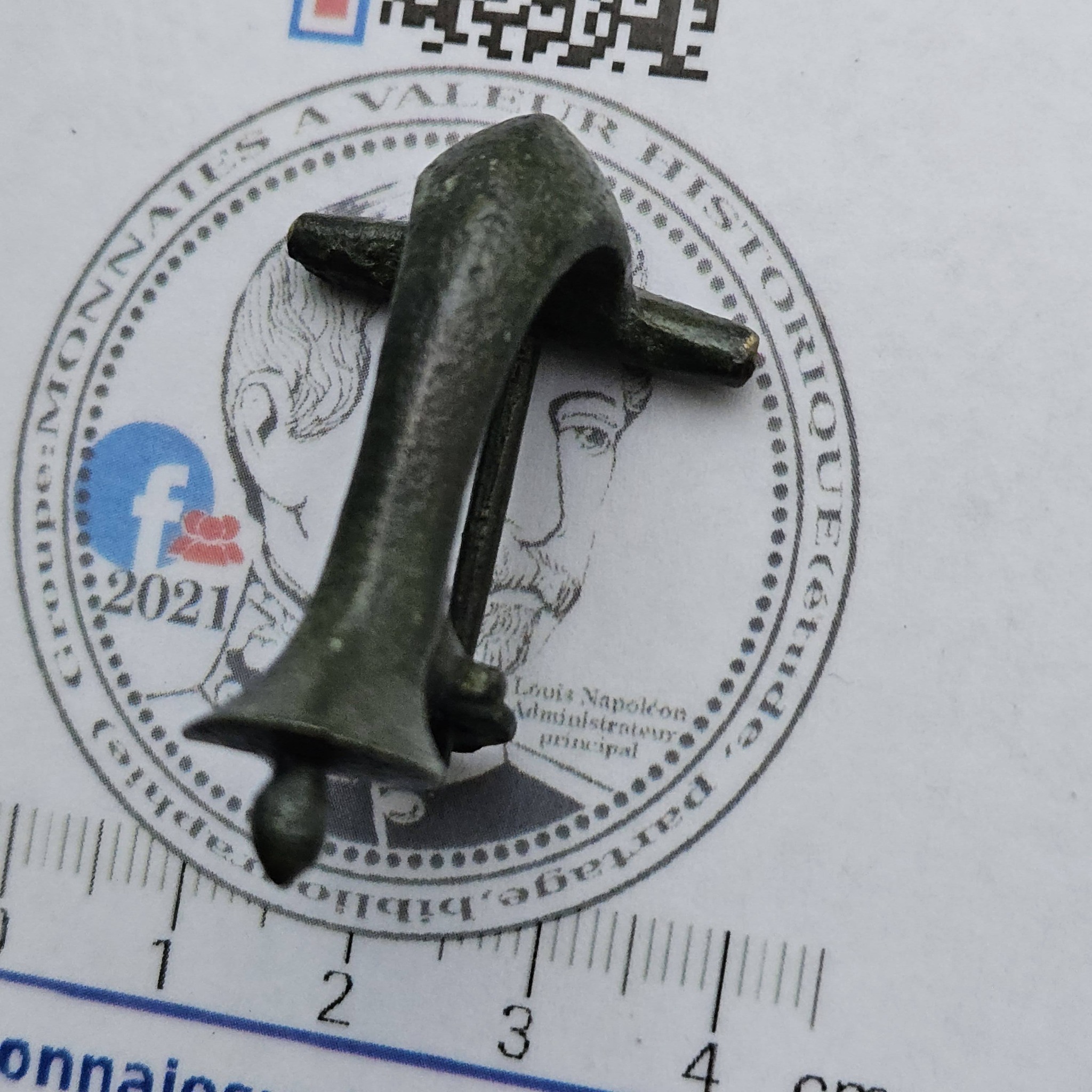 L’objet se distingue par un arc aux arêtes vives et une traverse élaborée formant le porte-ardillon. Le pied s’achève par un terminal moulé en forme de pomme de pin (bouton) stylisée, un symbole de fécondité et d’immortalité très apprécié à l’époque impériale.