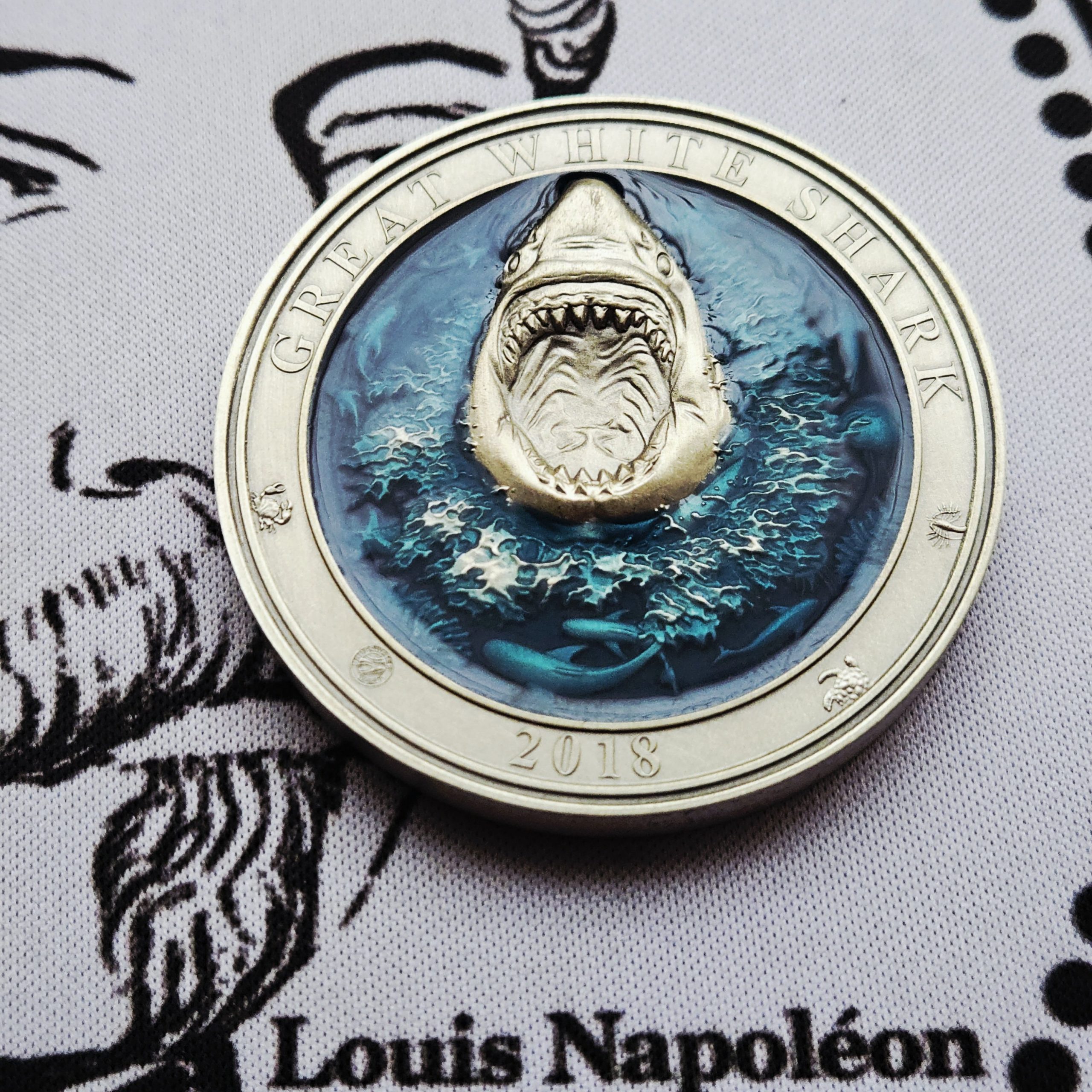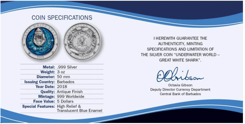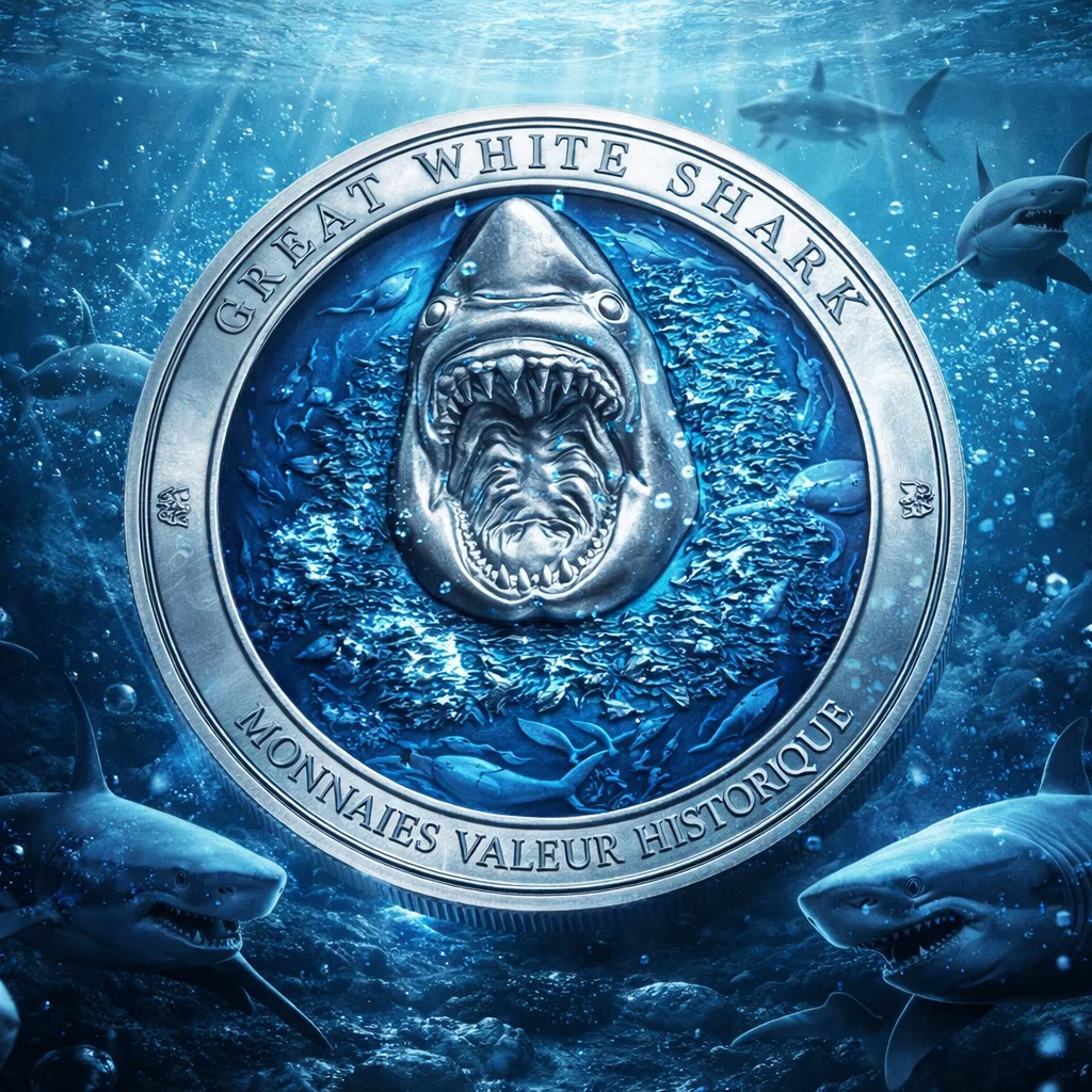 Véritable pièce de prestige, cette exceptionnelle monnaie en argent 3 onces inaugure la série « Underwater World » et rend hommage au prédateur ultime des océans : le grand requin blanc.