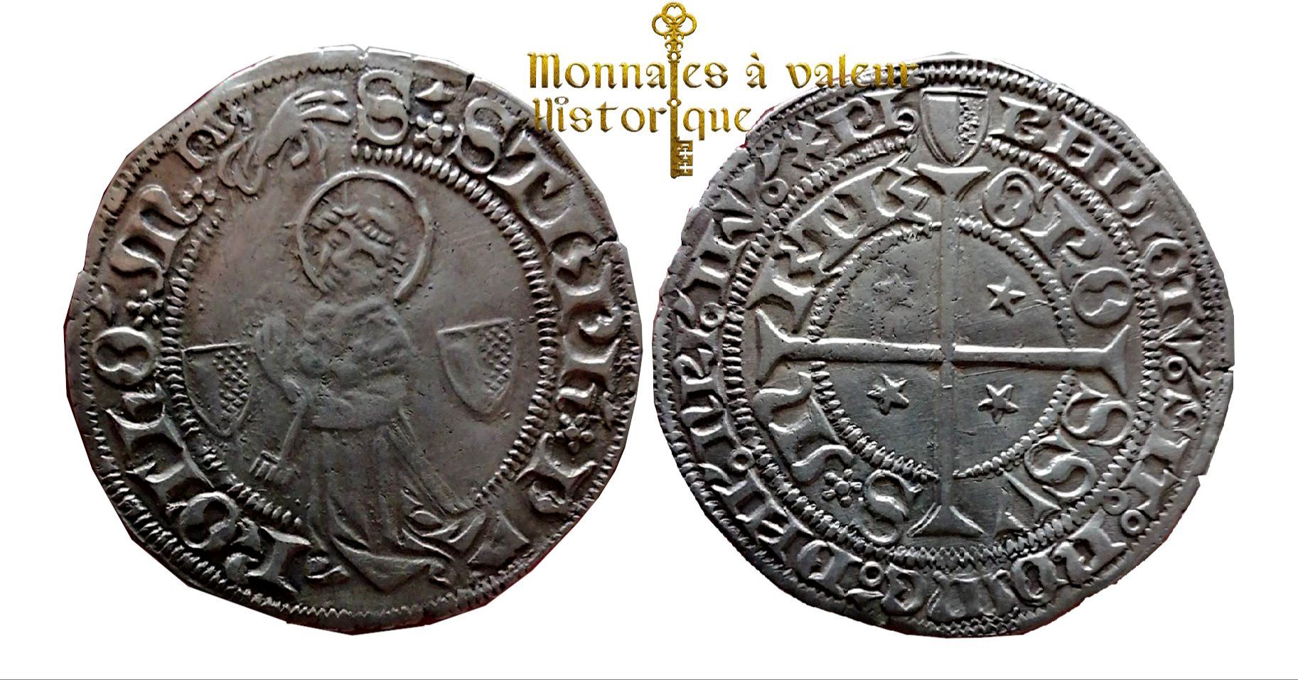 Ce gros, avec des lettres onciales, a probablement été frappé à la fin du XVe siècle ou au début du XVIe siècle. Ce type monétaire ayant été immobilisé pendant près de trois cents ans, la datation de ces gros est souvent assez approximative. Ce gros est frappé sur un flan large et assez régulier pour ce type de monnayage. Exemplaire recouvert d’une jolie patine grise de médaillier certain verront une légère faiblesses de frappe au niveau du personnage.Type : gros au saint-Étienne agenouillé