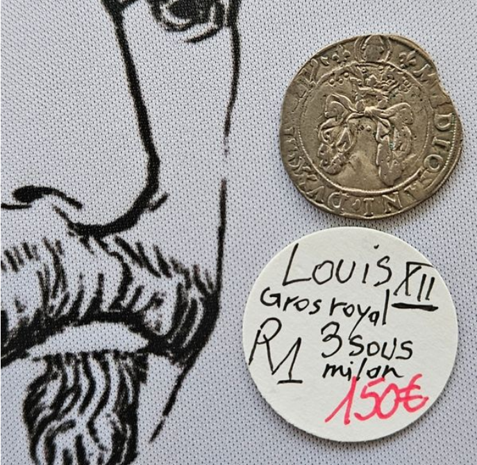 Ce « bissone » ou gros royal de 3 sous, frappé sous le règne de Louis XII, provient du Duché de Milan. Bien que non daté, il reste une pièce remarquable. Le recto présente l’écu de France couronné, entouré de deux guivres également couronnées. L’inscription en latin indique : « Louis, par la grâce de Dieu, roi des Francs ».