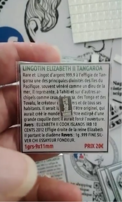 Rare et Lingot d’argent 999.9 à l’effigie de Tangaroa une des principales divinités des îles du Pacifique. souvent vénéré comme un dieu de la mer, il représente, à Tahiti et sur d’autres archipels comme ceux de Samoa, des Tonga et des Tuvalu, le créateur de l’Univers et de tous ses habitants. Il serait lui-même l’être originel, qui aurait créé le monde après s’être extirpé d’une grande coquille dont il aurait forcé l’ouverture. Avers : ELIZABETH II COOK ISLANDS IRB 10 CENTS 2012 Effigie droite de la reine Elizabeth II portant le diadème Revers : 1g .999 FINE SILVER CHI ESSAYEUR FONDEUR.