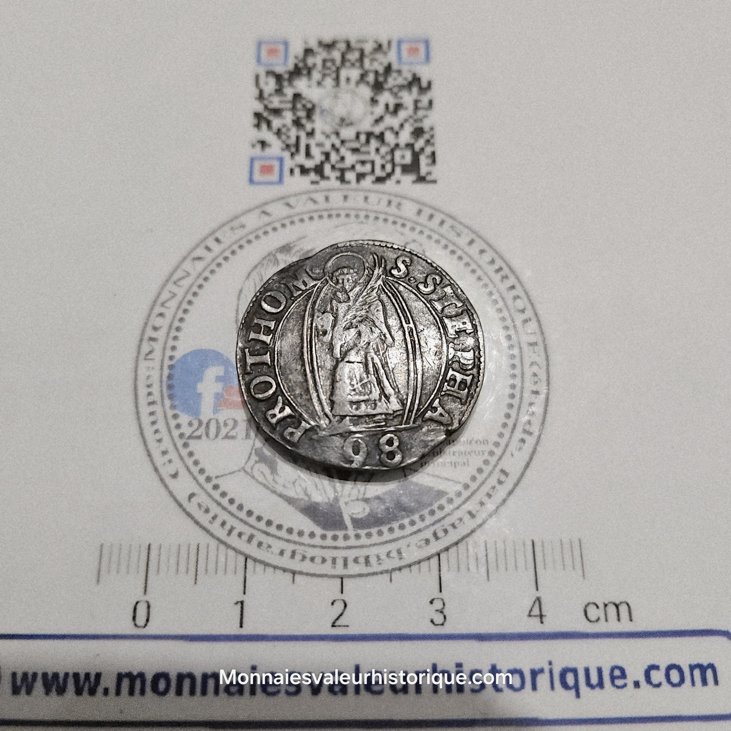 À l’avers figure Saint Étienne, patron de la ville et premier martyr du christianisme. Il est représenté debout, marchant vers la gauche, nimbé et vêtu de la chasuble. Il tient dans sa main droite des pierres, rappel explicite de son martyre par lapidation, et dans la main gauche une palme, symbole du sacrifice et de la victoire spirituelle. La scène est inscrite dans une ellipse, composition caractéristique des frappes messines de cette période. À l’exergue apparaît le millésime 1598. La titulature « S. STEPHA – PROTHOM. » souligne son statut de protomartyr.