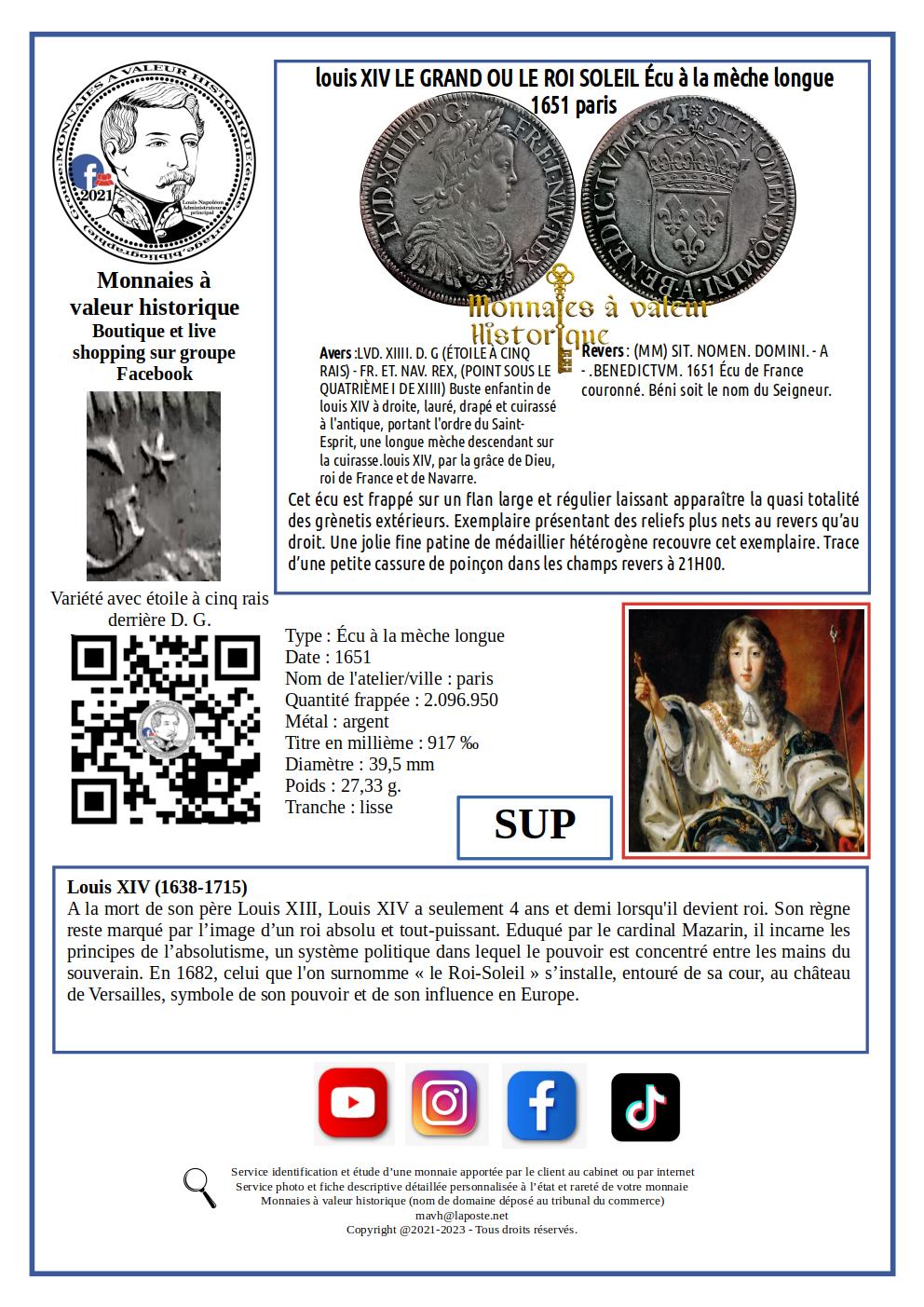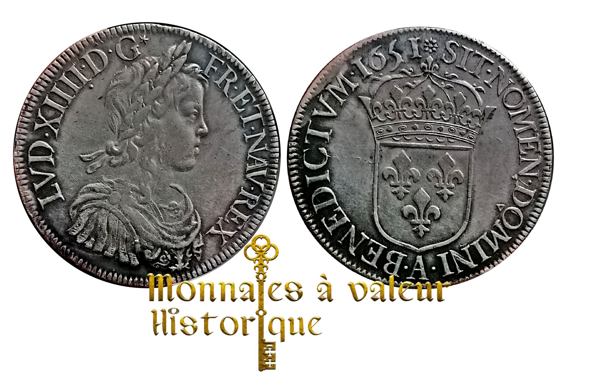 louis XIV LE GRAND OU LE ROI SOLEIL Écu à la mèche longue 1651 paris