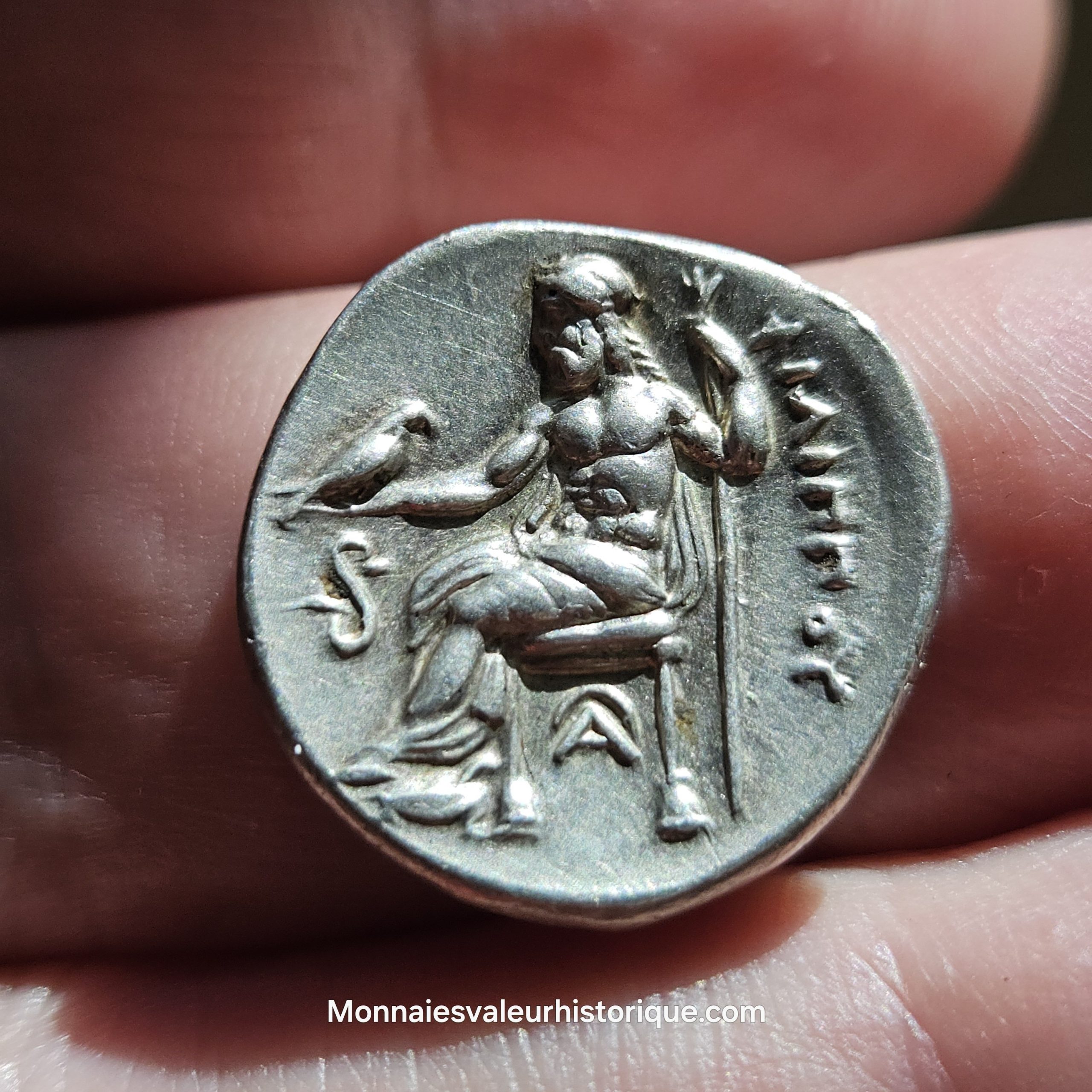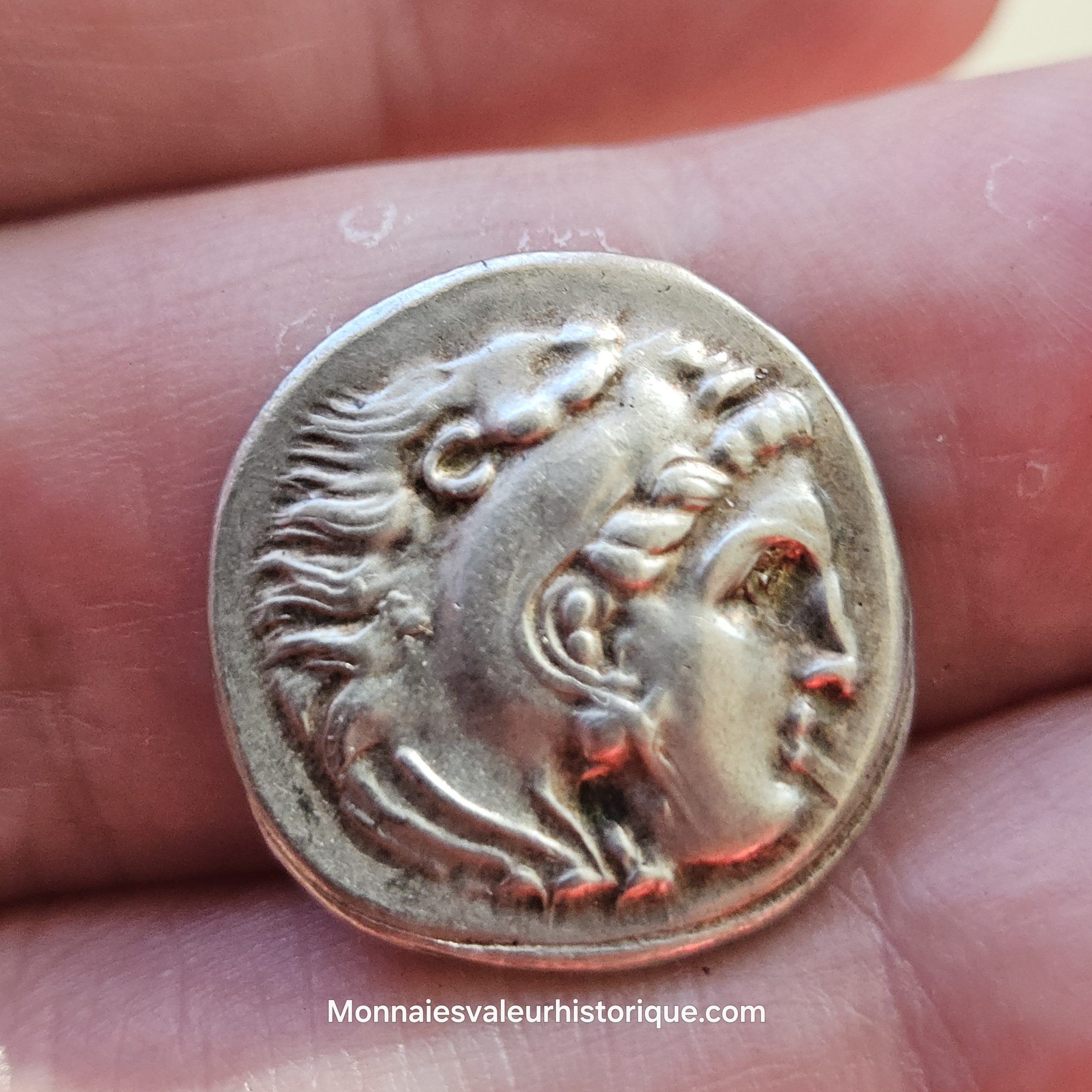 Exceptionnelle drachme macédonienne, quasi fleur de coin, offrant un portrait d’Héraclès et un revers magistral de Zeus, parmi les plus belles que nous ayons pu acquérir.