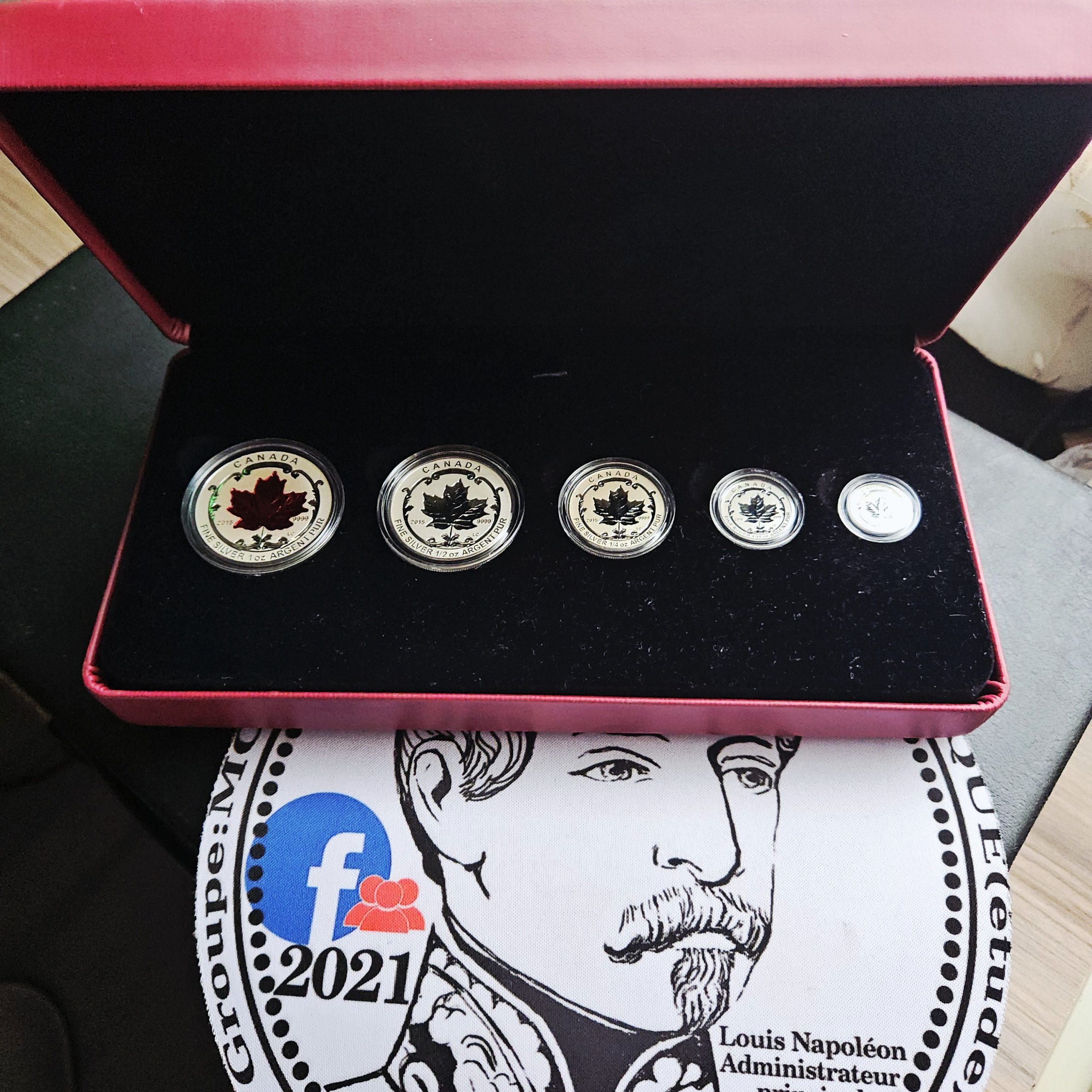 Une première mondiale ! Cet ensemble exceptionnel de cinq pièces en argent célèbre l’emblématique feuille d’érable à sucre, symbole indiscutable du Canada. La pièce d’une once est sublimée par un émail translucide rouge qui révèle avec élégance les nervures de la feuille, créant un effet visuel unique et raffiné.