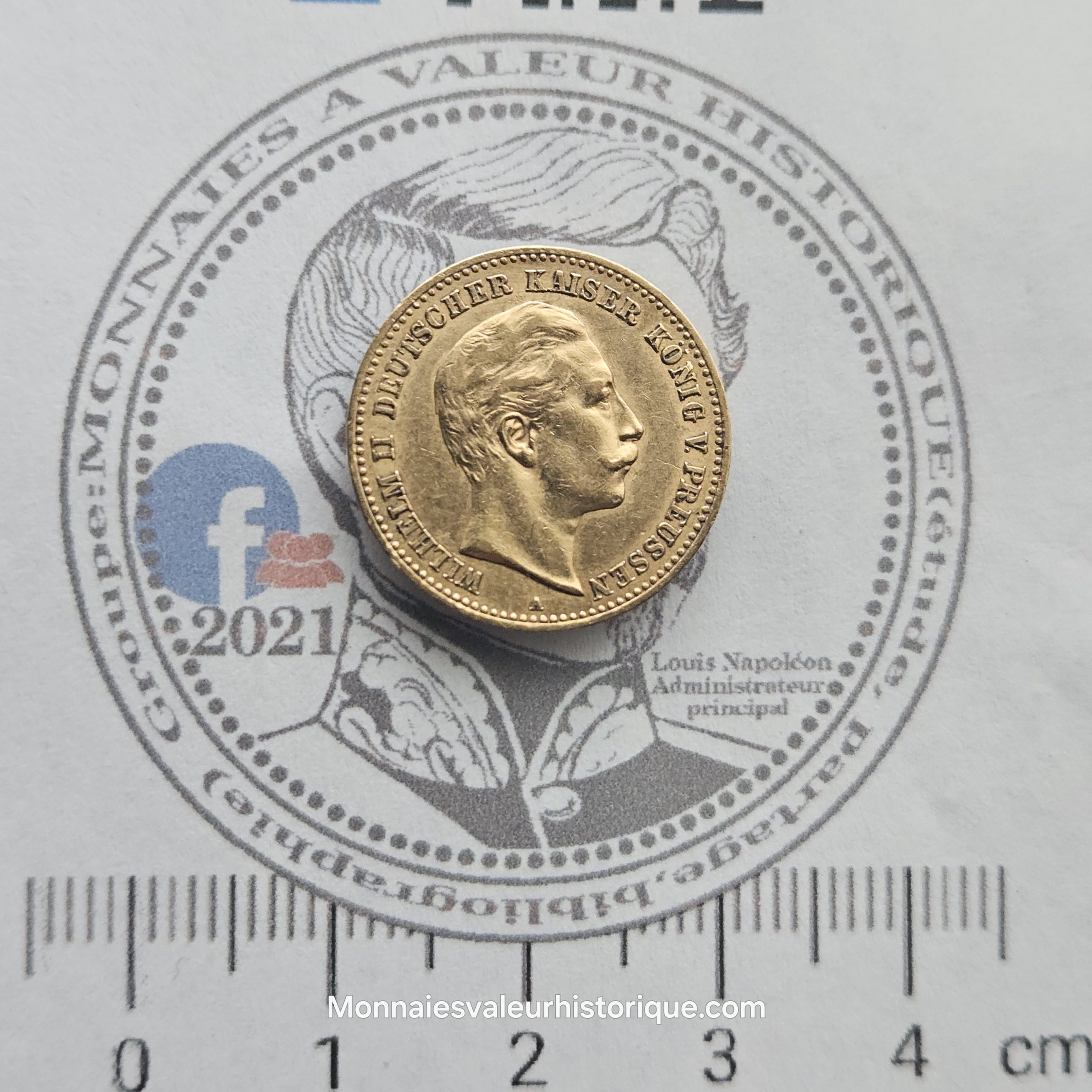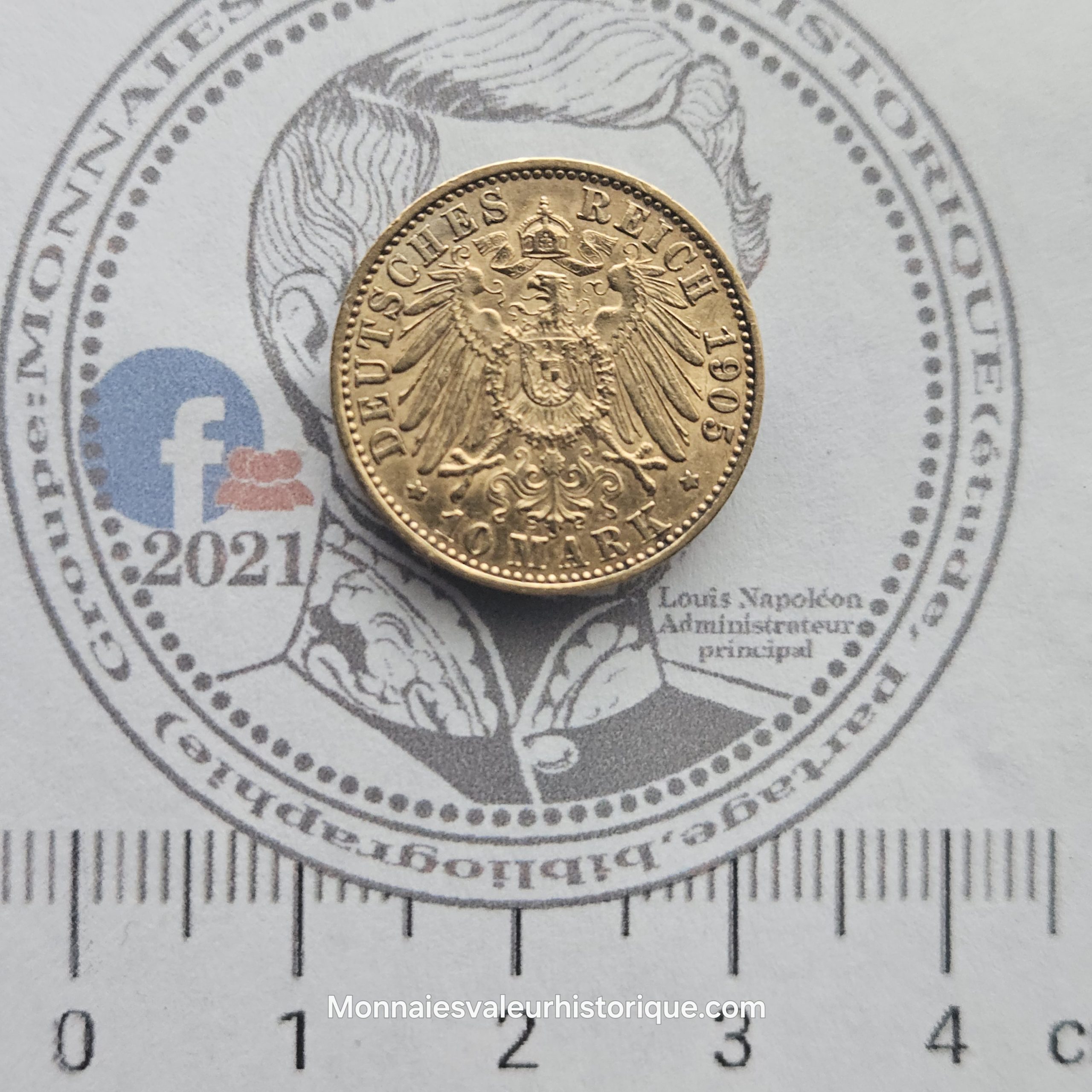 Catégorie : investissement Métal : or Année : 1905 Pays : Allemagne Fabricant : Münzprägestätten Poids brut : 4 g Titre : 900/1000 Diamètre : 19,50 mm Epaisseur : 0,91 mm Valeur faciale : 10 Mark