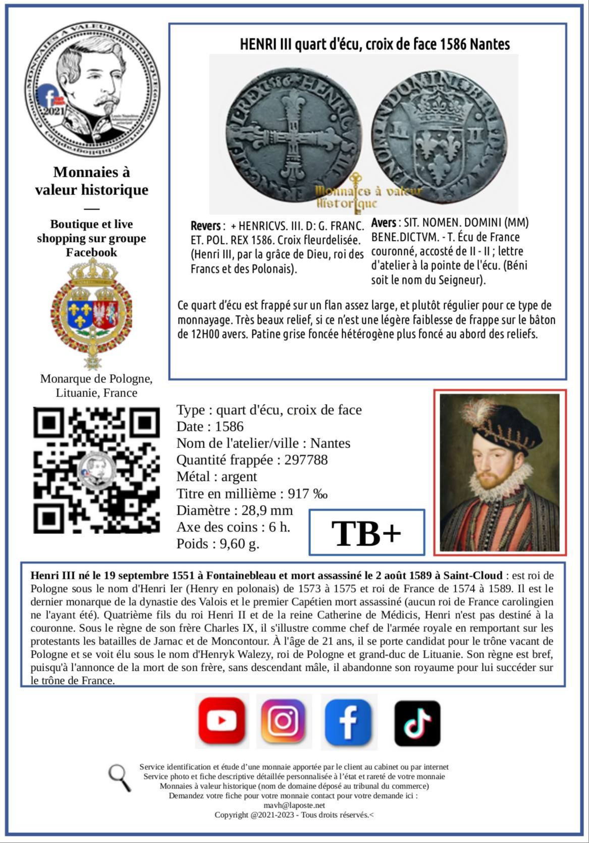 Je vous propose d’acquérir ce joli quart d’écu croix de face 1586 T frappé à Nantes, de HENRI III frappé sur une flan régulier, et avec une belle patine.