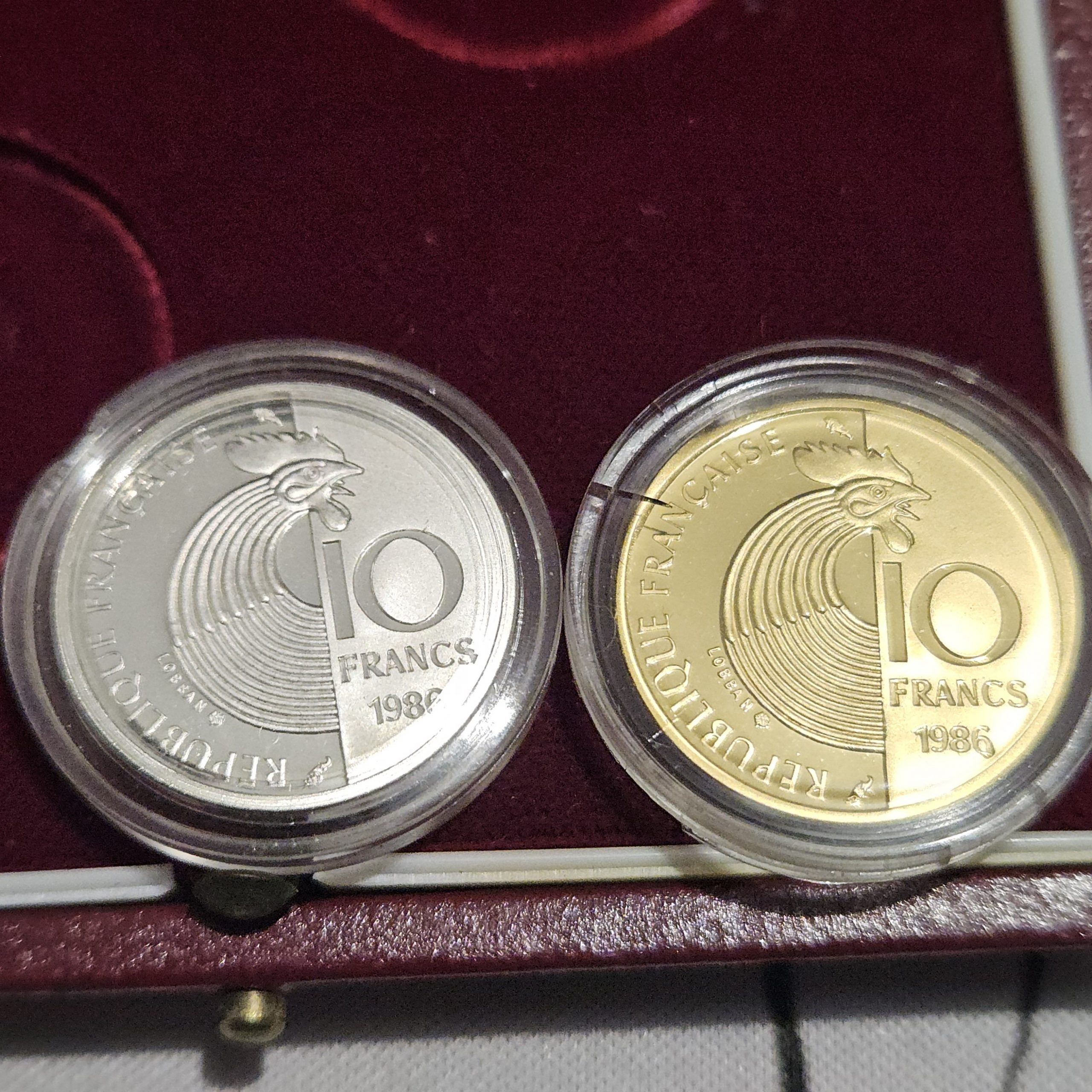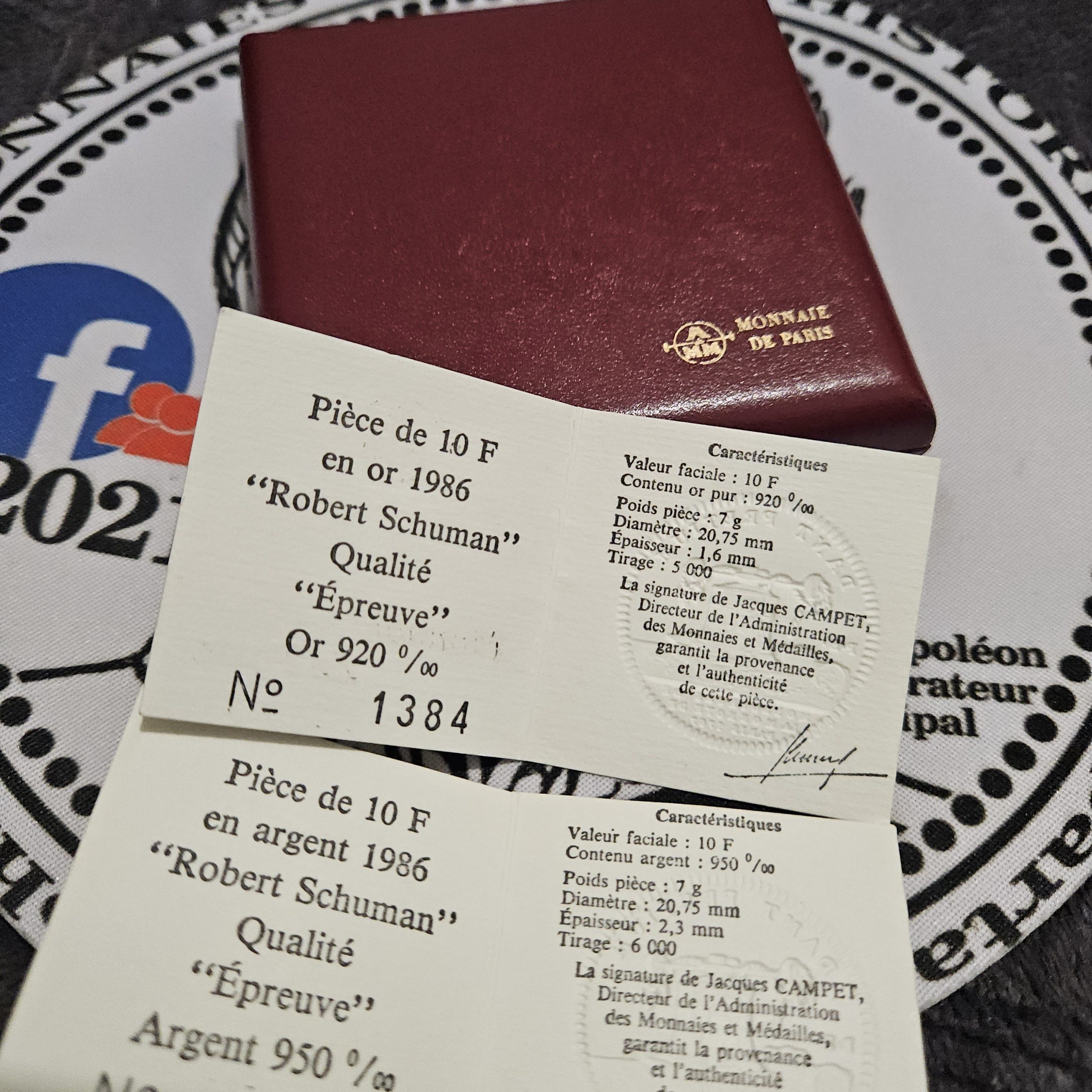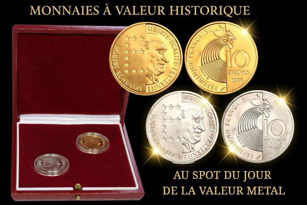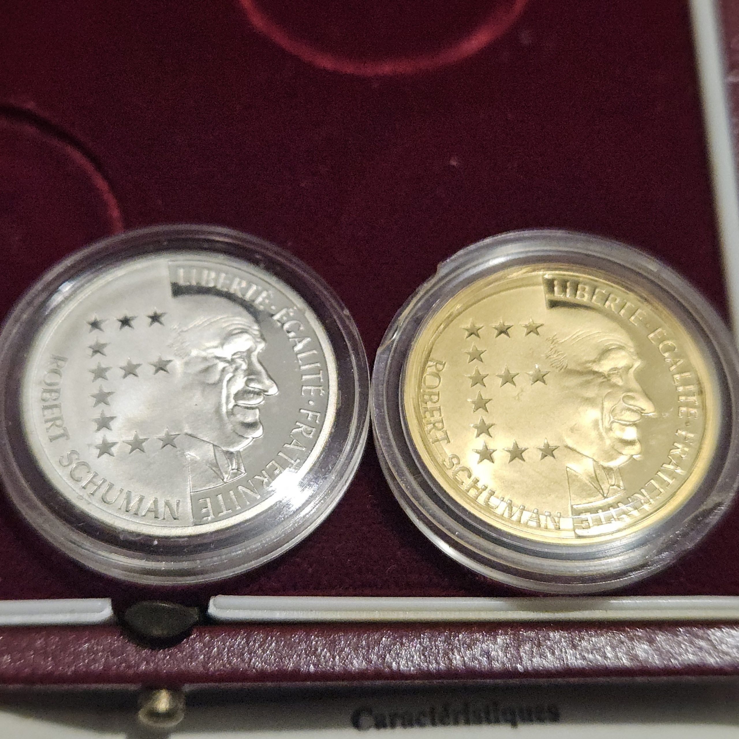 Nous vous proposons un superbe coffret officiel de la Monnaie de Paris, réunissant les deux monnaies commémoratives de 10 francs Robert Schuman frappées en Belle Épreuve en 1986, l’une en or, l’autre en argent.