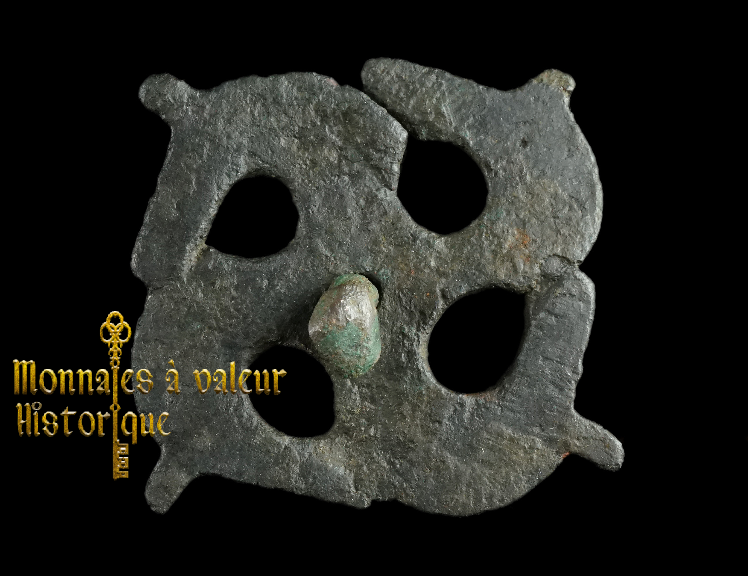 Une rivure centrale permettait de la fixer sur un coffret, un harnais ou tout autre élément décoratif. Elle conserve une patine antique harmonieuse, mêlant nuances brunes et vertes, qui accentue son charme et son authenticité.