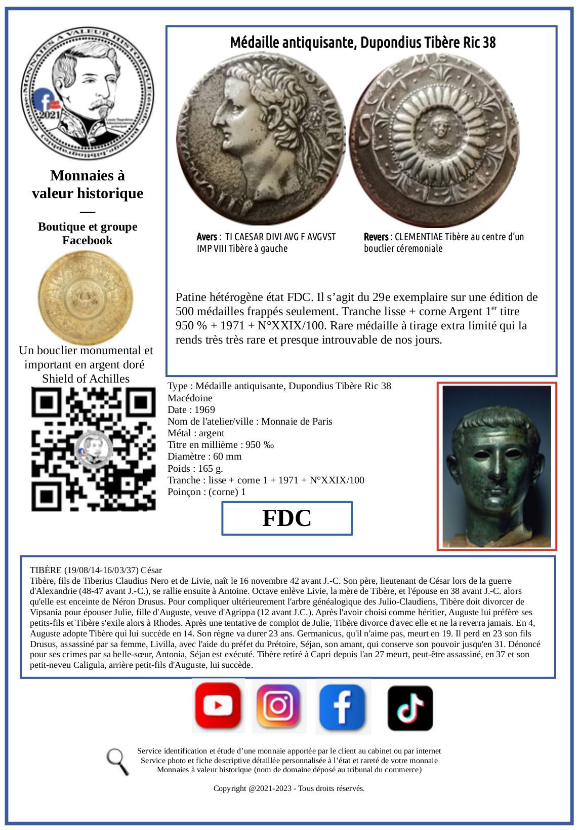 Médaille antiquisante, Dupondius Tibère Ric 38 – en argent massif !