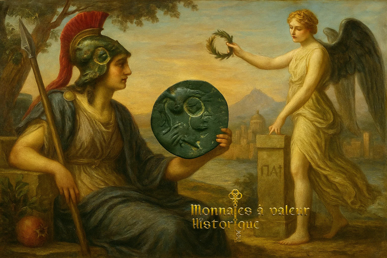 Athéna, la déesse casquée, apparaît tournée vers la droite. Symbole de protection et de sagesse, elle illustre la puissance guerrière et l’esprit stratégique qui accompagnaient les cités grecques.